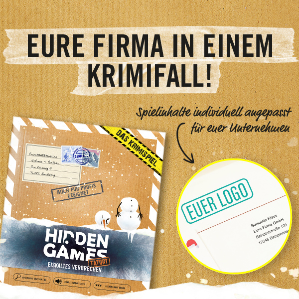 Ihr sucht nach einem persönlichen Geschenk für Mitarbeitende und Kund:innen? Wir geben eurer Firma einen Ehrenplatz in unserem Krimispiel! Die Firma wird mit Namen, Logo und einigen individualisierten Spielmaterialien direkt in den Kriminalfall mit eingebunden und trägt maßgeblich zur Aufklärung des Falls bei.